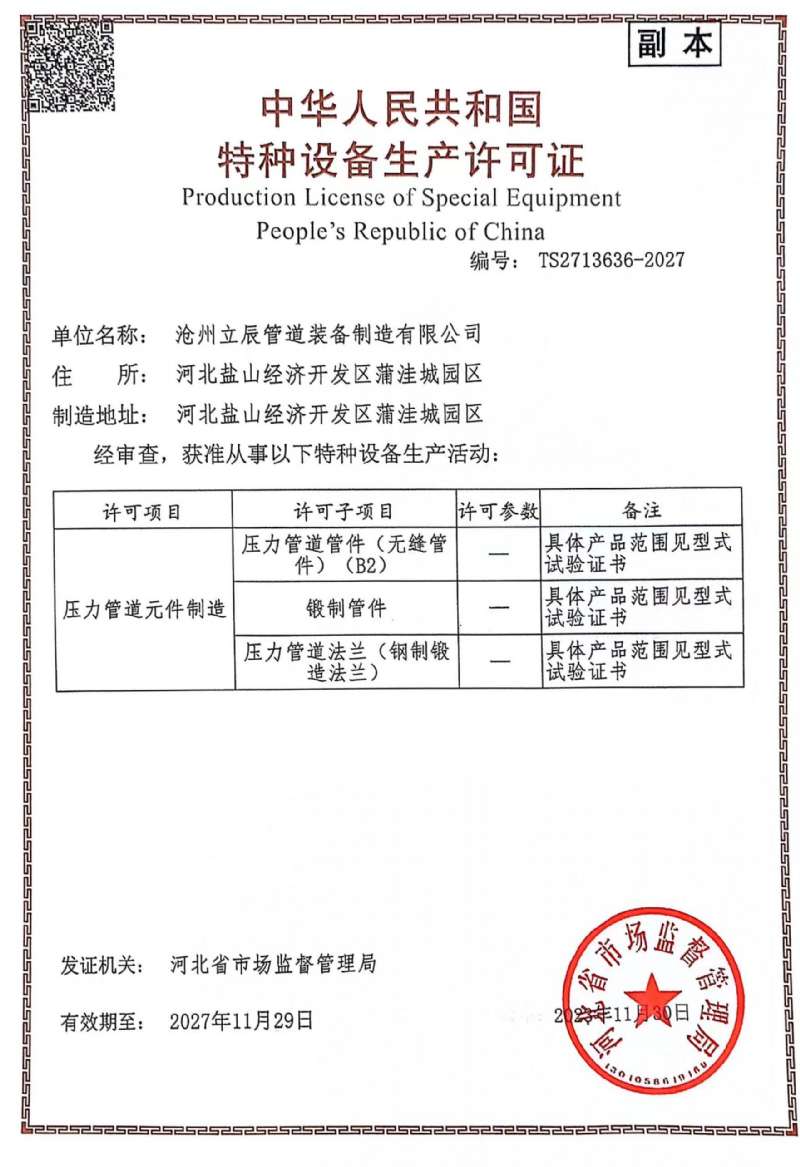 公司產(chǎn)品均通過(guò)ISO9001:2000質(zhì)量體系認(rèn)證彎頭、法蘭、彎管等產(chǎn)品,2001年被河北省技術(shù)監(jiān)督局批準(zhǔn)采用高國(guó)際標(biāo)準(zhǔn)認(rèn)可證書(shū);生產(chǎn)的不銹鋼彎頭獲省級(jí)優(yōu)質(zhì)產(chǎn)品稱(chēng)號(hào);Ф630-Ф720無(wú)縫推制彎頭為省內(nèi)首創(chuàng)。